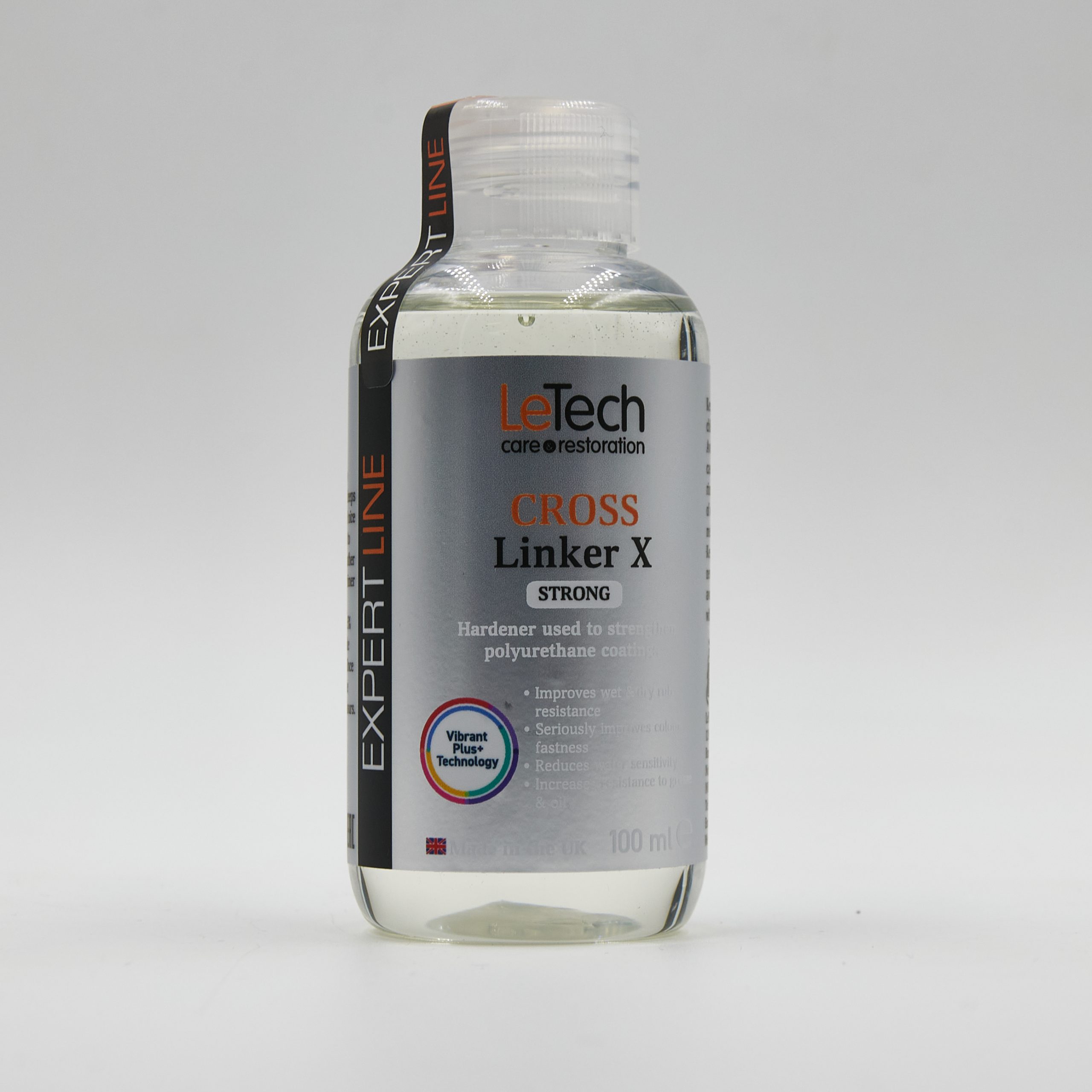Посилений затверджувач Leather Cross Linker X Strong EXPERT LINE від LeTech надає вашим покриттям відмінні експлуатаційні характеристики. Взаємодіючи з поліуретановими дисперсіями, Cross Linker X формує тривимірну мережу зшивання з взаємопроникними зв’язками. Внаслідок зміни фізичних властивостей, якість і довговічність покриття, його стійкість до зносу, а також стійкість до води і розчинників зростають.