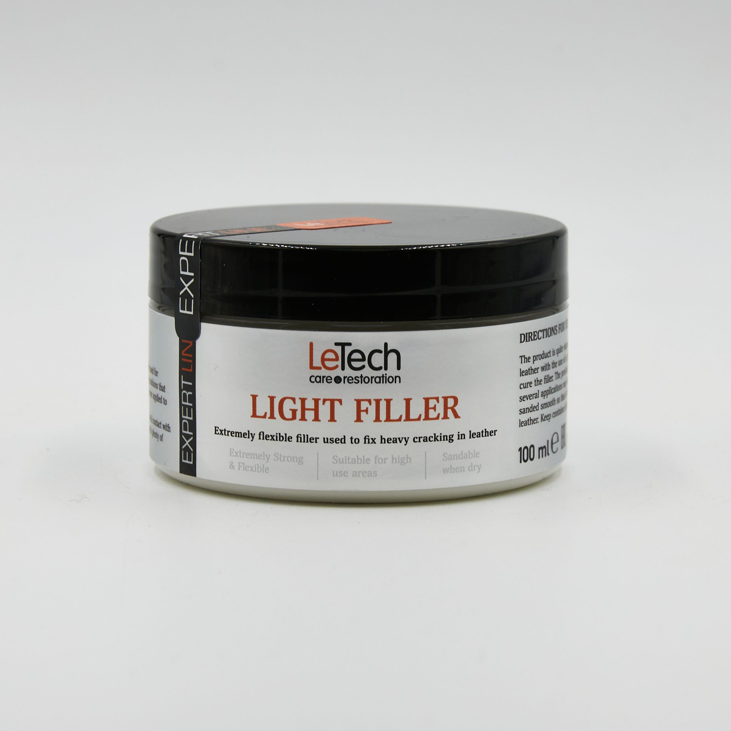 Light Filler є спеціалізованою, водоосновною заповнювальною сумішшю. Вона має в’язку, однорідну консистенцію і легко наноситься шпателем. Light Filler заповнює ушкодження, утворюючи дуже міцний зв’язок з шкірою. Після остаточного висихання Light Filler має еластичну структуру і міцність на розрив, що дозволяє шкірі бути в нормальному використанні. Light Filler зберігає свої властивості протягом тривалого часу без тріщин або відшарувань. Light Filler — це рідка ремонтна суміш для ремонту всіх видів шкіряних виробів і підходить для напіванілінової шкіри, яку потім фарбують за допомогою Leather Colourant.